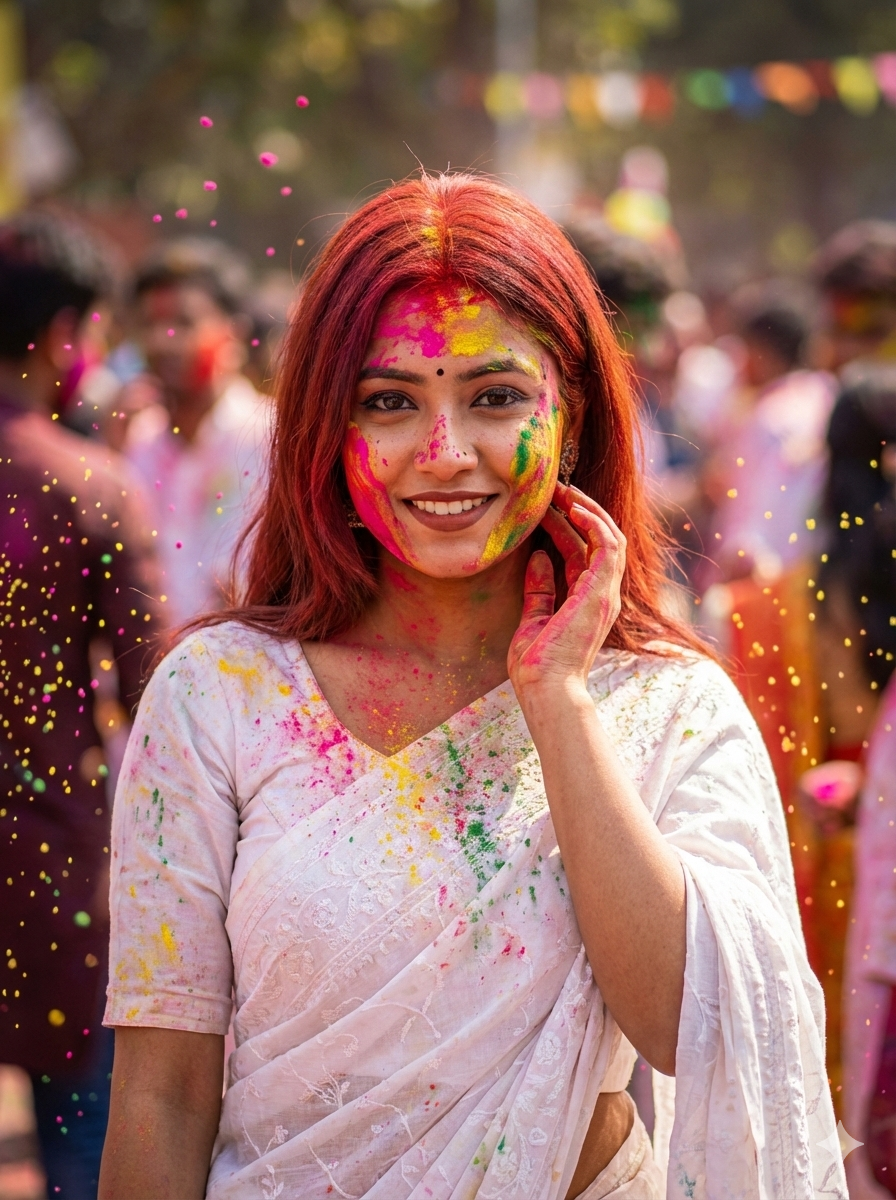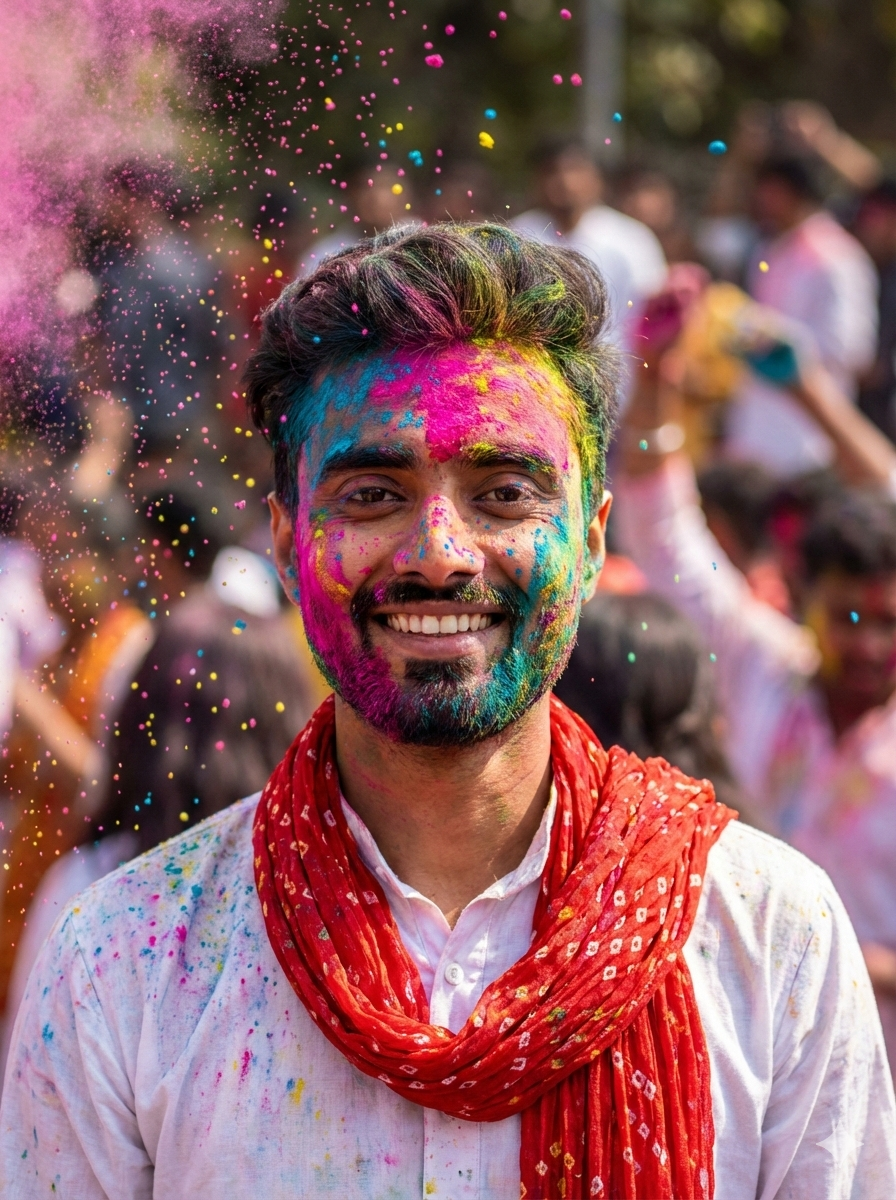 hand covered in colorful powder, smiling confidently at the camera. Add colorful powder splashes floating in the air for a festive mood. The background should show a lively crowd but remain softly blurred with a strong bokeh effect. Use natural sunlight, soft skin tones, ultra-detailed face, sharp focus, shallow depth of field, cinematic color grading, DSLR photography style, 85mm lens, HDR, 4K quality, vertical composition (3:4), photorealistic.