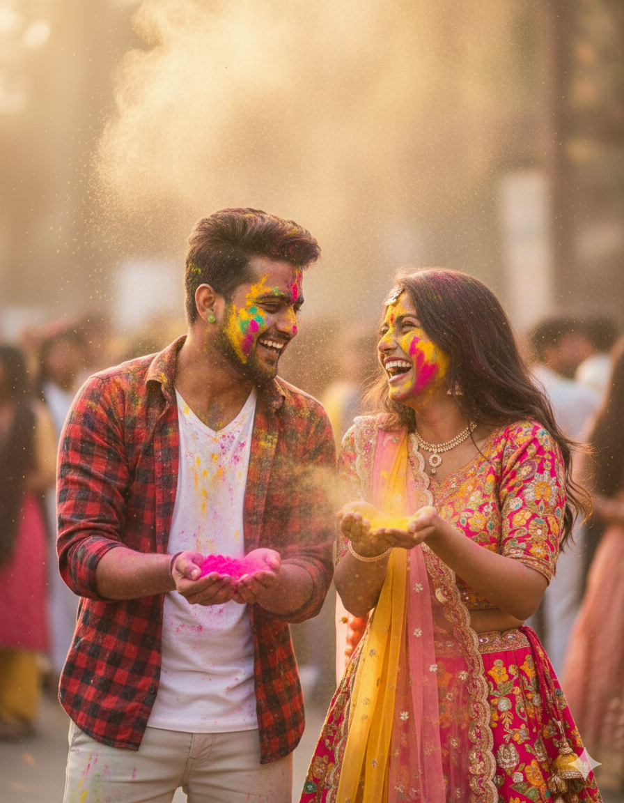 and romantic atmosphere. Add soft sunlight with a golden glow, colorful powder mist in the air, and a lively crowd in the background with a creamy bokeh effect. Ultra-detailed faces, natural skin texture, sharp focus, shallow depth of field, cinematic color grading, DSLR photography style, 85mm lens look, HDR, 4K quality, photorealistic, vertical composition (9:16).