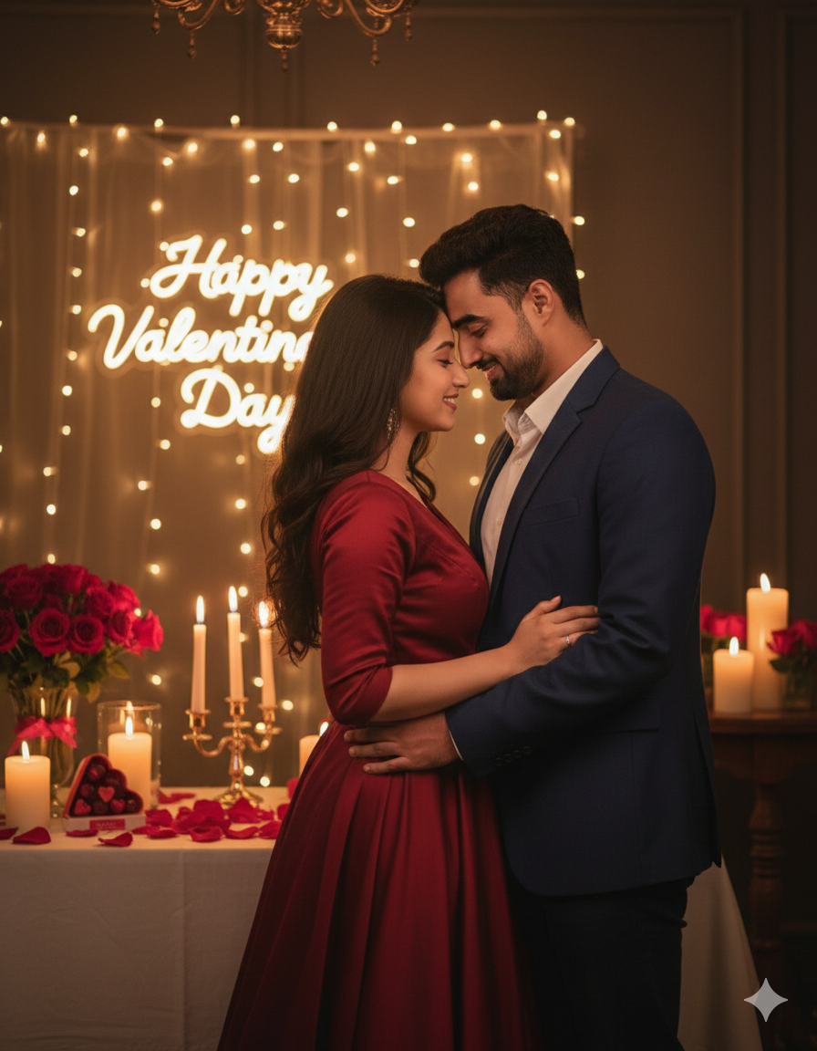 Ultra-realistic Valentine’s Day romantic couple portrait, luxury café decorated indoor setup, warm golden lighting, fairy lights, candles, heart décor ও red roses। Young couple very close in romantic pose (gentle embrace/ forehead touch), same faces preserved, natural happy smiles, genuine emotional connection। Boy in smart semi-formal outfit, girl in elegant red/romantic dress। Nearby romantic table with roses, chocolates, candles, optional “Happy Valentine’s Day” sign। Photorealistic DSLR 85mm style, f/1.8, sharp faces, creamy bokeh, cinematic warm red tones, realistic skin texture, vertical 4:5, professional Instagram-ready, dreamy love-filled mood, 8K clarity।