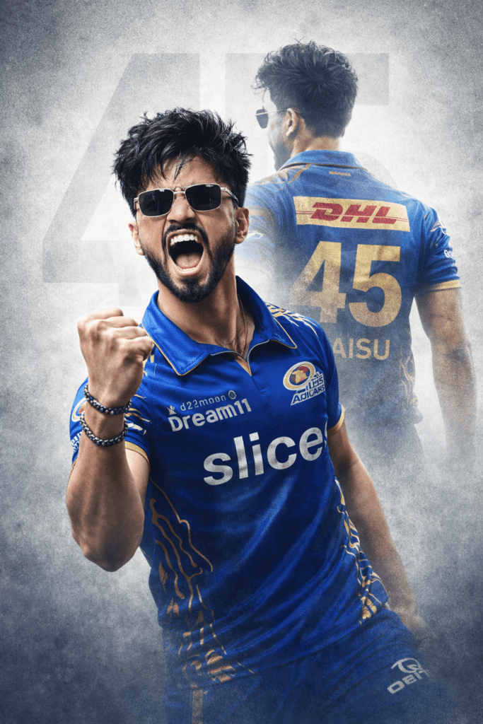 A high-quality sports poster featuring a young South Asian man with a sharp quiff hairstyle, wearing rectangular black sunglasses. He is dressed in a Mumbai Indians (MI) cricket jersey in iconic royal blue and gold. Featuring official MI branding and sponsor logos.The design uses a powerful double exposure effect: in the foreground. He is captured mid-shout in an intense, triumphant celebration with a clenched fist. In the background, a larger, faded silhouette of him is shown from behind, displaying the name "YOUR NAME" and the jersey number "45", symbolizing leadership and dominance.The background is a clean, textured light gray with a large, subtle "45" watermark. Cinematic lighting. Dramatic contrast, sharp focus, ultra-detailed 8K resolution, professional sports poster graphic design style