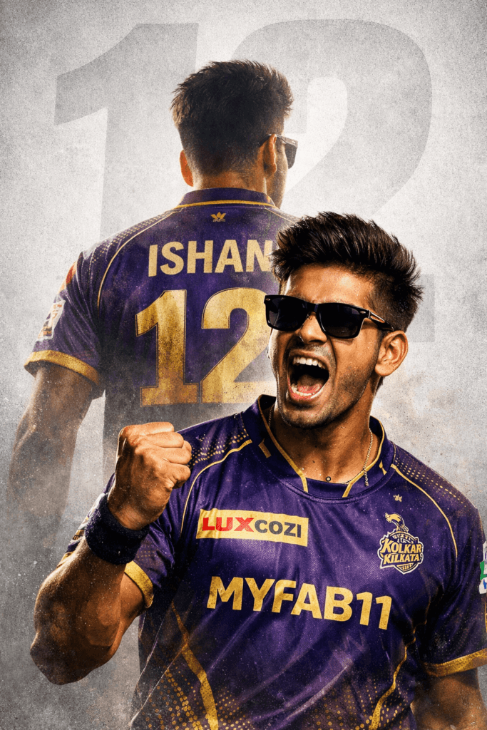 A high-quality sports poster featuring a young South Asian man with a modern hairstyle, wearing rectangular black sunglasses. He is dressed in a Kolkata Knight Riders (KKR) cricket jersey in royal purple and gold, with official KKR branding and sponsor logos.The design uses a cinematic double exposure effect: in the foreground, he is celebrating aggressively with a clenched fist. In the background, a faded silhouette from behind displays the name "YOUR NAME" and the jersey number "12", symbolizing power and strategic dominance.The background is a clean, textured light gray with a large, subtle "12" watermark. Cinematic lighting, dramatic shadows, ultra-detailed 8K resolution, professional sports poster graphic design style.