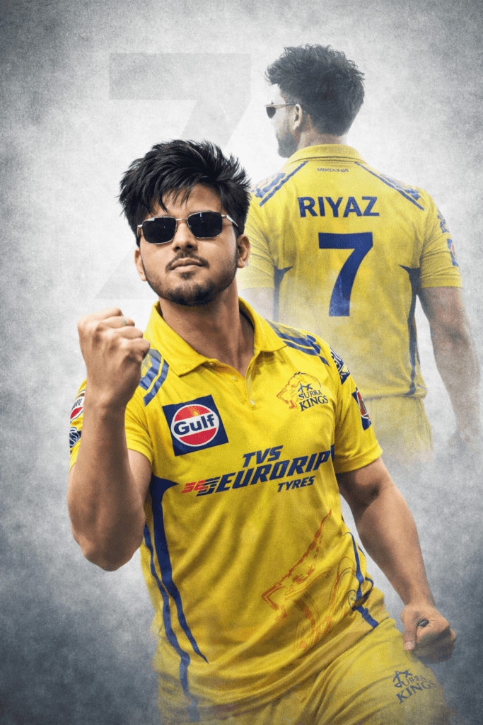 -A high-quality sports poster featuring a young South Asian man with a sharp quiff hairstyle. Wearing rectangular black sunglasses. He is dressed in a Chennai Super Kings (CSK) cricket jersey in iconic yellow with blue accents. Featuring official CSK branding and sponsor logos.The design uses a powerful double exposure effect: in the foreground. He is captured mid-shout in a calm yet victorious celebration with a clenched fist. In the background, a faded silhouette from behind displays the name "YOUR NAME" and the jersey number "7", representing legendary composure and championship mindset.The background is a clean, textured light gray with a large, subtle "7" watermark. Cinematic lighting, dramatic contrast, ultra-detailed 8K resolution, professional sports poster graphic design style.