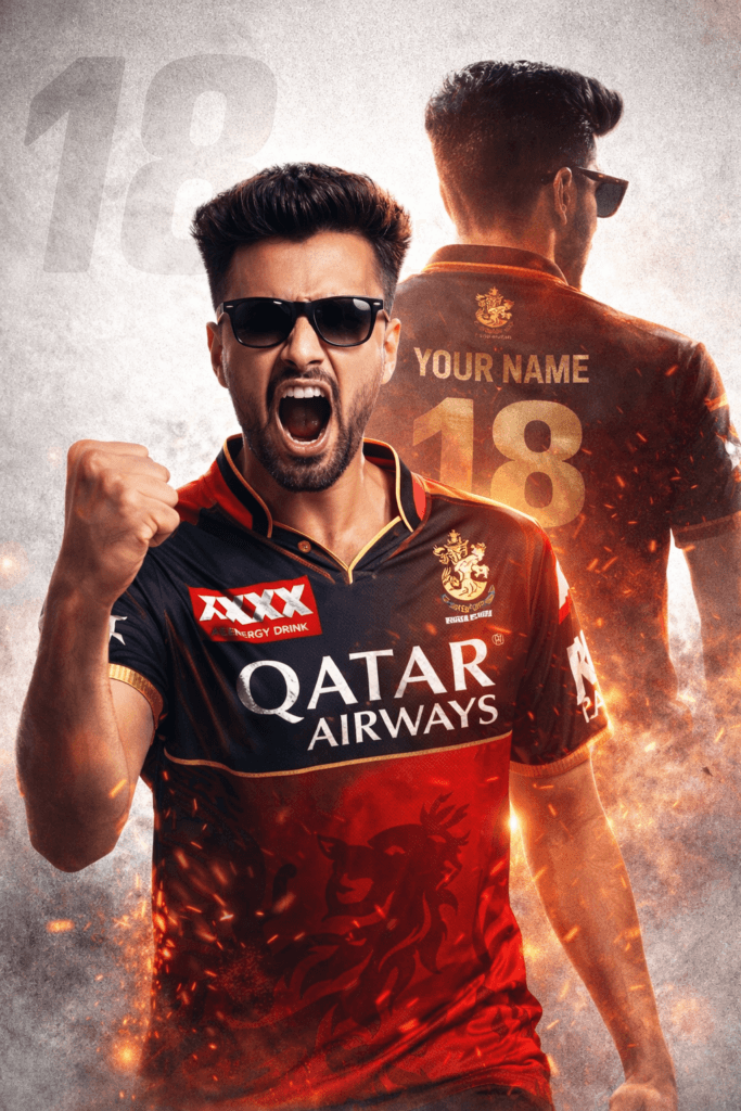 A high-quality sports poster featuring a young South Asian man with a sharp quiff hairstyle, wearing rectangular black sunglasses. He is dressed in a Royal Challengers Bengaluru (RCB) cricket jersey in red, black, and gold, featuring official RCB branding and sponsor logos.The design uses a powerful double exposure effect: in the foreground. He is captured mid-roar with a clenched fist, expressing aggression and passion. In the background, a larger faded silhouette from behind shows the name "YOUR NAME" and the jersey number "18", symbolizing intensity and fearless energy. The background is a clean, textured light gray with a large, subtle "18" watermark. Cinematic lighting, dramatic contrast, ultra-detailed 8K resolution, professional sports poster graphic design style.