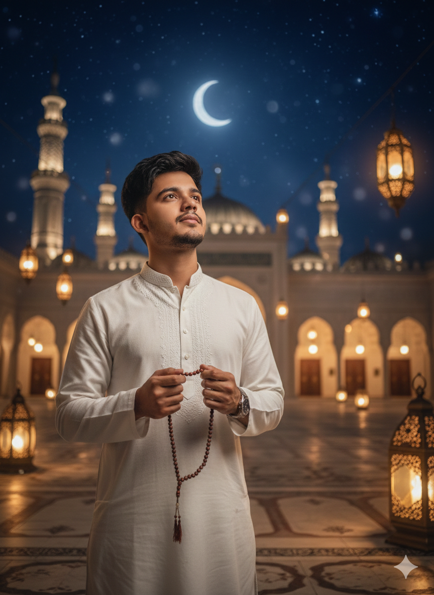 Cinematic Ramadan night scene of a young Muslim man standing near a mosque courtyard, holding prayer beads (tasbih), warm lantern lights, Islamic architecture in background, starry sky with crescent moon, soft bokeh lights, emotional and spiritual mood, ultra-realistic, high detail, professional photography