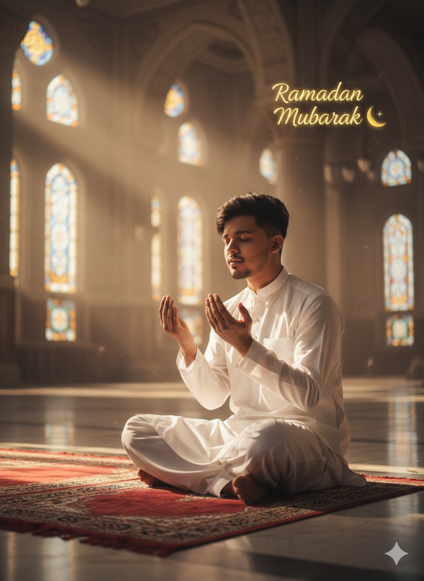 Create a realistic Ramadan prayer scene using the same reference face. Do not change my face at all. He is sitting inside a grand mosque after prayer, soft sunlight entering through windows. Prayer mat in front, hands raised in dua position. White traditional outfit. Peaceful emotional expression. Add soft elegant text: “Ramadan Mubarak 🌙” High realism, warm natural light, spiritual atmosphere.