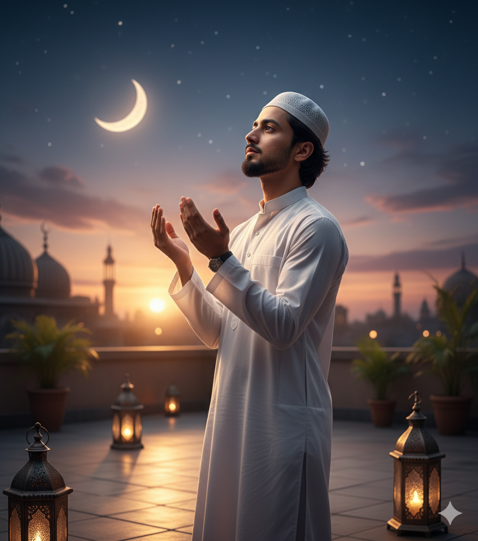 Ultra-realistic portrait of a young Muslim boy standing on a rooftop at dusk, wearing a white kurta and skull cap, hands raised in dua, calm and peaceful expression, glowing crescent moon in the sky, soft golden lantern lights around, Ramadan atmosphere, cinematic lighting, shallow depth of field, 85mm lens, ultra detailed, 4K realism