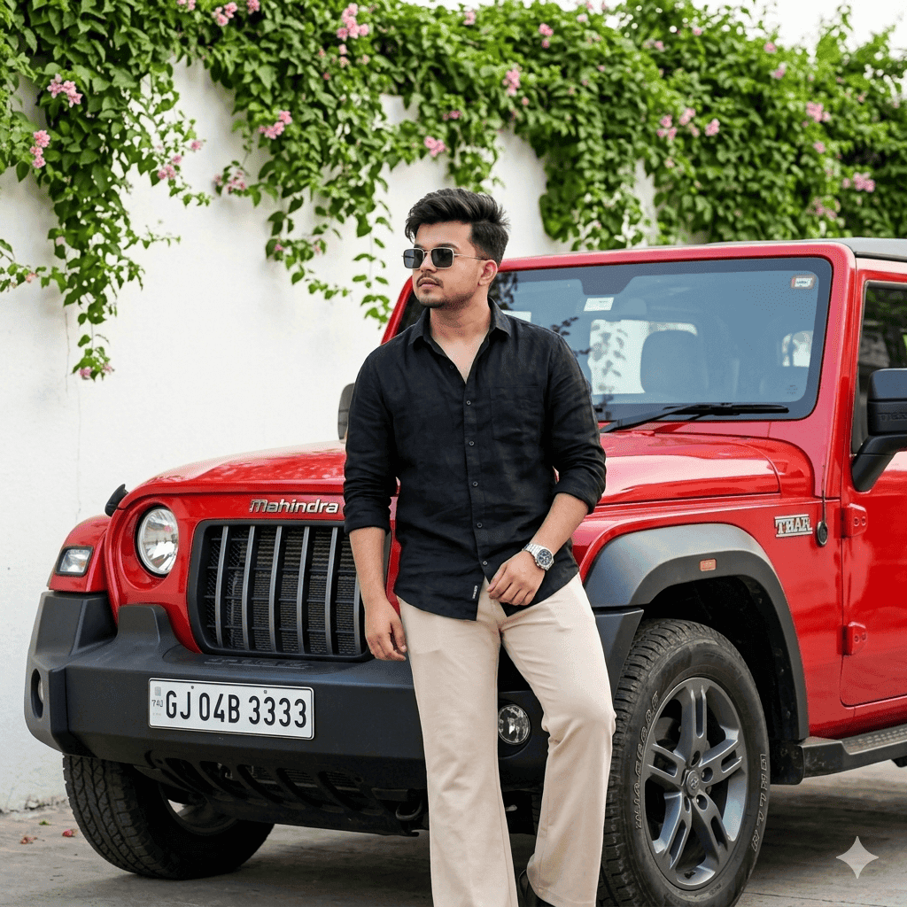 Using Reference photo, Generate Ultrarealistic image of stylish young man standing outdoors in bright natural sunlight leaning on Red Thar, car number : GJ 04B 3333, wearing black Lenin shirt , Modern wolf hair, pant is beige bell bottom. He is wearing square sunglasses and a wristwatch, a natural pose . Confident and calm expression, looking sideways. Background features a clean white wall covered with lush green plants and small pink flowers. with a vertical 3:4 aspect ratio