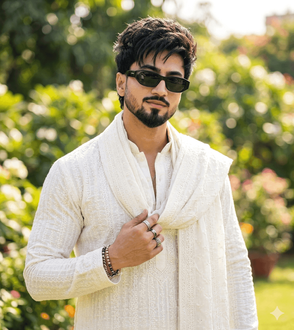 'Ultra-realistic DSLR photography of the young man from the reference image, maintaining strict facial consistency. He is wearing a premium white embroidered kurta and a matching elegant scarf draped over his shoulder. One hand is stylishly holding the edge of the kurta near his chest. He wears sleek black sunglasses and strikes a confident pose in a lush outdoor garden. The lighting is bright, natural sunlight creating a cinematic feel. The background features beautifully blurred greenery with a soft bokeh effect. High detail on the fabric texture of the kurta and scarf, 4K ultra HD.'