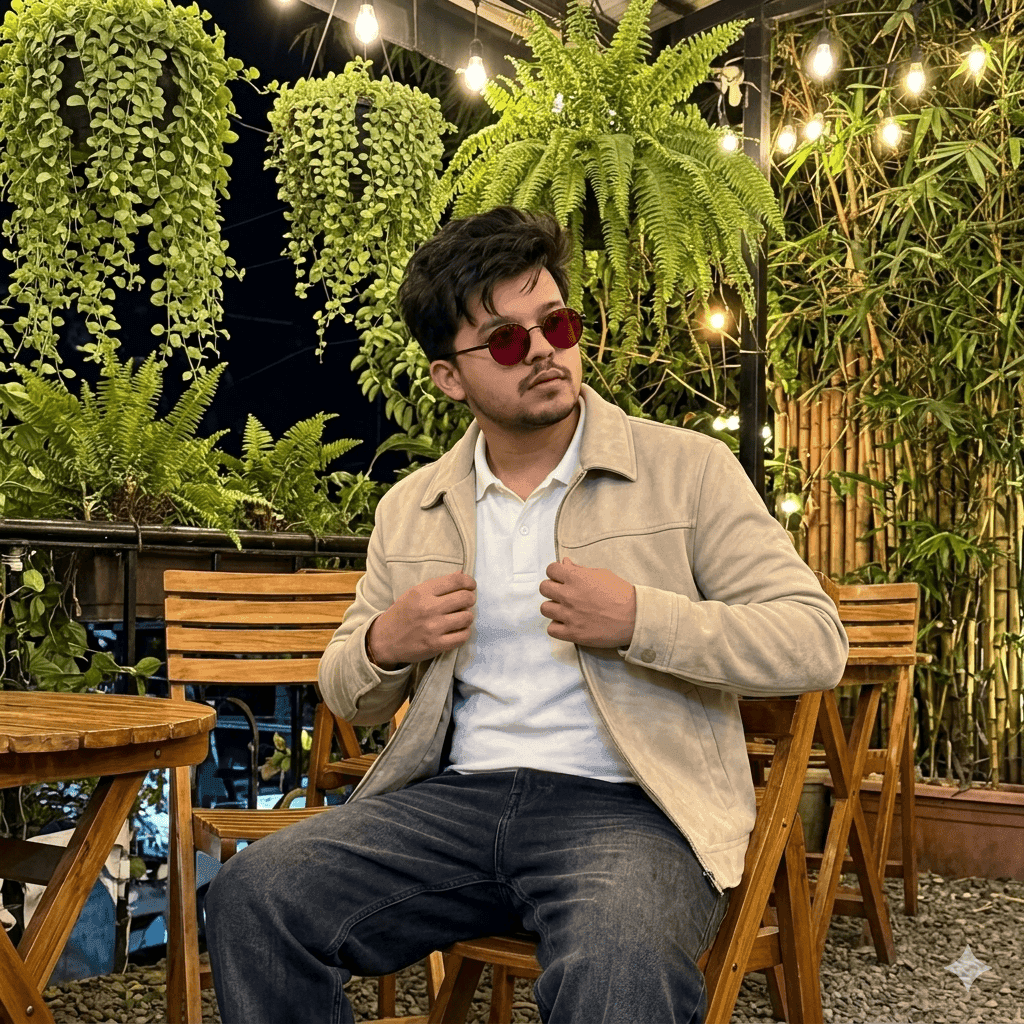 USE MY UPLOADED IMAGE KEEPING MY EXACT REAL FACE SKIN TONE, HAIRSTYLE UNCHANGED.ULTRA-REALISTIC IPHONE 15 PRO MAX PHOTO OF A YOUNG MAN SITTING AT A COZY OUTDOOR CAFÉ AT NIGHT SURROUNDED BY LUSH GREEN HANGING PLANTS AND BAMBOO IN THE BACKGROUND.HE IS SEATED ON A WOODEN CHAIR BESIDE A SMALL WOODEN TABLE, SLIGHTLY ADJUSTING HIS LIGHT BEIGE SUEDE JACKET OVER A WHITE POLO SHIRT PAIRED WITH LOOSE DARK JEANS HIS HEAD IS SLIGHTLY TILTED SIDE, MESSY DARK HAIR FALLING NATURALLY OVER HIS FOREHEAD2. DARK RED CIRCLE SUNGLASSES