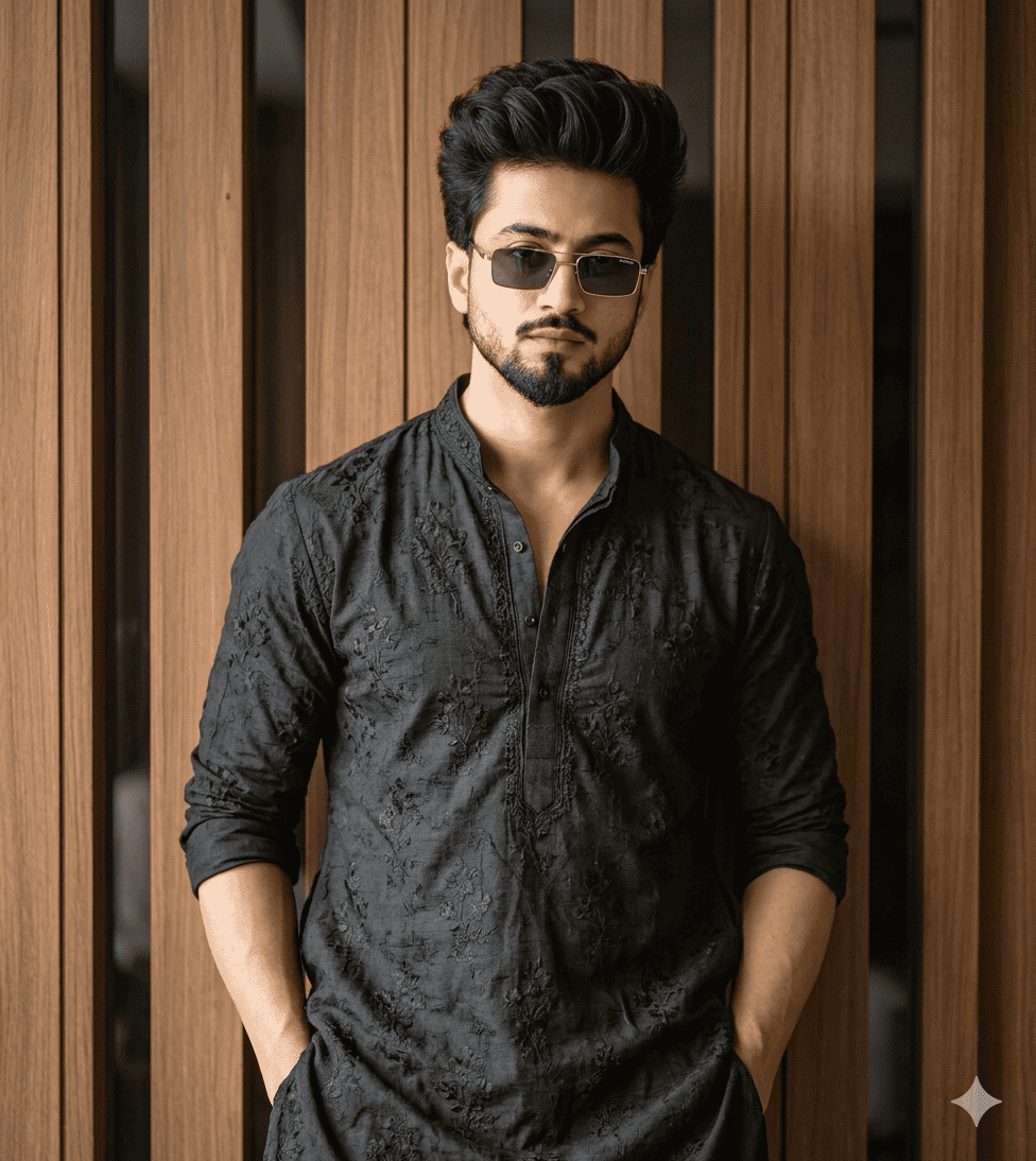 Ultra-realistic 4K portrait of a stylish young Indian man standing confidently against a modern vertical wooden panel background, wearing a dark charcoal black embroidered kurta with subtle floral patterns, sleeves slightly folded, hands casually in pockets, well-groomed beard and voluminous styled hair, sharp jawline, intense confident expression, soft natural lighting from one side creating cinematic shadows, high-detail fabric texture, realistic skin texture, shallow depth of field, professional fashion photography, DSLR quality, 85mm lens, f/1.8 aperture, ultra HD, sharp focus, natural color grading, premium editorial look, 8k resolution, hyper detailed, photorealistic.
